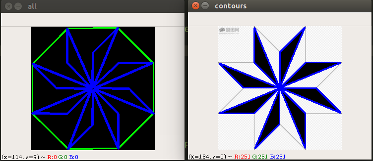 #-*- coding:utf-8 -*- import cv2 import numpy as np '''created on Tues jan 10:49:30 2018@author:ren_dong凸轮廓和Douglas-Peucker算法cv2.approxPloyDP()CV2.arcLength()cv2.convexHull()''' #读入图像img img = cv2.pyrDown(cv2.imread('arc.jpg', cv2.IMREAD_COLOR))#resize #img = cv2.resize(img, None, fx=0.6, fy=0.6, interpolation=cv2.INTER_CUBIC)#创建空白图像,用来绘制多边形轮廓 curve = np.zeros(img.shape,np.uint8)#灰度变换 gray = cv2.cvtColor(img.copy(), cv2.COLOR_BGR2GRAY)#使用定制kernel 进行中值滤波,去除一些噪声 kernel = np.ones((3,3),np.float32) / 9 #这里的-1表示目标图像和原图像具有同样的深度,比如cv2.CV_8U gray = cv2.filter2D(gray,-1,kernel)#阈值化 gray image --> binary image # 输入图像必须为单通道8位或32位浮点型 # 这里使用cv2.THRESH_BINARY_INV 实现效果像素>125 设置为0(黑) 否则设置为255(白) ret, thresh = cv2.threshold(gray, 127, 255, cv2.THRESH_BINARY_INV)#寻找轮廓 返回修改后的图像, 图像轮廓 以及他们的层次 image, contours, hierarchy = cv2.findContours(thresh, cv2.RETR_TREE, cv2.CHAIN_APPROX_SIMPLE)##假设contours[0]为最大轮廓 cnt = contours[0] max_area = cv2.contourArea(cnt)##遍历contours, 和原始设置比较,获得最大轮廓区域 for i in contours:if cv2.contourArea(i) > max_area:cnt = imax_area = cv2.contourArea(cnt) print('max_area:',max_area)##获得轮廓周长 epsilon = 0.01 * cv2.arcLength(cnt, True)#计算得到近似的多边形框 approx = cv2.approxPolyDP(cnt, epsilon, True)#得到凸包 hull = cv2.convexHull(cnt)print('contours', len(contours), type(contours)) print('cnt.shape', cnt.shape, type(cnt)) print('approx.shape', approx.shape, type(approx)) print('hull.shape', hull.shape, type(hull))#在原图像得到原始的轮廓 cv2.drawContours(img, contours, -1, (255, 0 , 0),2)#在空白图像中得到最大轮廓, 多边形轮廓, 凸包轮廓 cv2.drawContours(curve, [cnt], -1, (0, 0, 255), 1) # cv2.drawContours(curve, [hull], -1, (0, 255, 0), 2) ##绿色多边形轮廓 线宽2 cv2.drawContours(curve, [approx], -1, (255, 0, 0), 3) ##蓝色凸包轮廓 线宽3cv2.imshow('contours',img) cv2.imshow('all',curve)cv2.waitKey() cv2.destroyAllWindows()运行结果如下: