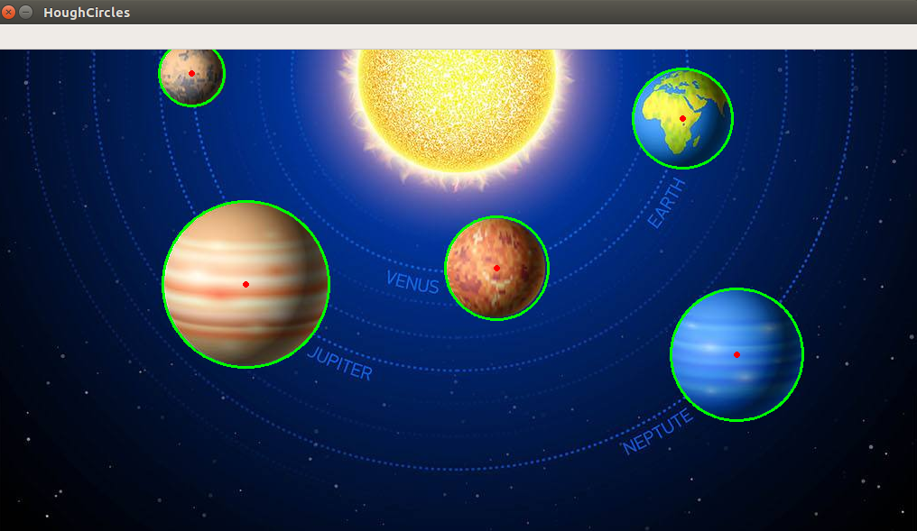#-*- coding:utf-8 -*- import cv2 import numpy as np '''created on Tues jan 14:37:10 2018@author:ren_dongHough变换检测圆cv2.HoughCricles()''' #载入图片img img = cv2.imread('plant.jpg')#灰度化处理 --> gray image gray = cv2.cvtColor(img, cv2.COLOR_BGR2GRAY)##中值滤波 图像平滑 gray = cv2.medianBlur(gray, 7)##Hough变换检测圆 circles = cv2.HoughCircles(gray, cv2.HOUGH_GRADIENT, 1, 200,param1=200, param2=20, minRadius= 0, maxRadius=0 )circles = np.uint16(np.around(circles))##绘制圆 for i in circles[0,:]:cv2.circle(img, (i[0], i[1]), i[2], (0, 255, 0), 2)cv2.circle(img, (i[0], i[1]), 2, (0, 0, 255), 2)cv2.imshow('HoughCircles',img)cv2.waitKey() cv2.destroyAllWindows()实现效果如下: