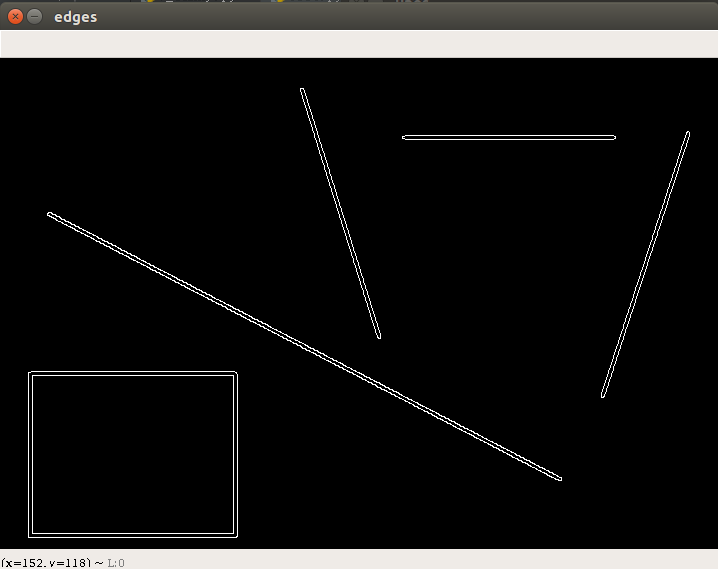 注意:HoughLinesP函数会接收一个由Candy边缘检测滤波器处理过的单通道二值图像。不一定需要Candy滤波器,但是一个经过去噪并且只有边缘的图像当中Hough变换的输入会很不错,因此使用Candy滤波器是一个普遍的惯例。