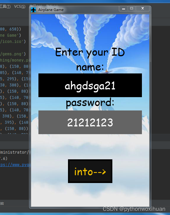 first = Falsedef Init():global color1, color2, OK_IF, name, password, firstwhile True:screen.blit(bg, (0, 0))word = 'Enter your ID'for event in pygame.event.get():if event.type == pygame.QUIT:sys.exit()elif event.type == pygame.KEYDOWN:if color1 == (100, 100, 100) and len(name) < 18:if event.key == pygame.K_a:name += 'a'elif event.key == pygame.K_b:name += 'b'elif event.key == pygame.K_c:name += 'c'elif event.key == pygame.K_d:name += 'd'elif event.key == pygame.K_e:name += 'e'elif event.key == pygame.K_f:name += 'f'elif event.key == pygame.K_g:name += 'g'elif event.key == pygame.K_h:name += 'h'elif event.key == pygame.K_i:name += 'i'elif event.key == pygame.K_j:name += 'j'elif event.key == pygame.K_k:name += 'k'elif event.key == pygame.K_l:name += 'l'elif event.key == pygame.K_m:name += 'm'elif event.key == pygame.K_n:name += 'n'elif event.key == pygame.K_o:name += 'o'elif event.key == pygame.K_p:name += 'p'elif event.key == pygame.K_q:name += 'q'elif event.key == pygame.K_r:name += 'r'elif event.key == pygame.K_s:name += 's'elif event.key == pygame.K_t:name += 't'elif event.key == pygame.K_u:name += 'u'elif event.key == pygame.K_v:name += 'v'elif event.key == pygame.K_w:name += 'w'elif event.key == pygame.K_x:name += 'x'elif event.key == pygame.K_y:name += 'y'elif event.key == pygame.K_z:name += 'z'elif event.key == pygame.K_SPACE:name += ' 'elif event.key == pygame.K_1:name += '1'elif event.key == pygame.K_2:name += '2'elif event.key == pygame.K_3:name += '3'elif event.key == pygame.K_4:name += '4'elif event.key == pygame.K_5:name += '5'elif event.key == pygame.K_6:name += '6'elif event.key == pygame.K_7:name += '7'elif event.key == pygame.K_8:name += '8'elif event.key == pygame.K_9:name += '9'elif event.key == pygame.K_0:name += '0'elif color2 == (100, 100, 100) and len(password) < 18:if event.key == pygame.K_a:password += 'a'elif event.key == pygame.K_b:password += 'b'elif event.key == pygame.K_c:password += 'c'elif event.key == pygame.K_d:password += 'd'elif event.key == pygame.K_e:password += 'e'elif event.key == pygame.K_f:password += 'f'elif event.key == pygame.K_g:password += 'g'elif event.key == pygame.K_h:password += 'h'elif event.key == pygame.K_i:password += 'i'elif event.key == pygame.K_j:password += 'j'elif event.key == pygame.K_k:password += 'k'elif event.key == pygame.K_l:password += 'l'elif event.key == pygame.K_m:password += 'm'elif event.key == pygame.K_n:password += 'n'elif event.key == pygame.K_o:password += 'o'elif event.key == pygame.K_p:password += 'p'elif event.key == pygame.K_q:password += 'q'elif event.key == pygame.K_r:password += 'r'elif event.key == pygame.K_s:password += 's'elif event.key == pygame.K_t:password += 't'elif event.key == pygame.K_u:password += 'u'elif event.key == pygame.K_v:password += 'v'elif event.key == pygame.K_w:password += 'w'elif event.key == pygame.K_x:password += 'x'elif event.key == pygame.K_y:password += 'y'elif event.key == pygame.K_z:password += 'z'elif event.key == pygame.K_SPACE:password += ' 'elif event.key == pygame.K_1:password += '1'elif event.key == pygame.K_2:password += '2'elif event.key == pygame.K_3:password += '3'elif event.key == pygame.K_4:password += '4'elif event.key == pygame.K_5:password += '5'elif event.key == pygame.K_6:password += '6'elif event.key == pygame.K_7:password += '7'elif event.key == pygame.K_8:password += '8'elif event.key == pygame.K_9:password += '9'elif event.key == pygame.K_0:password += '0'if color1 == (100, 100, 100):if event.key == pygame.K_BACKSPACE:name = name[:-1]elif color2 == (100, 100, 100):if event.key == pygame.K_BACKSPACE:password = password[:-1]font_label = font1.render(word, True, 'black')label_w, label_h = font1.size(word)screen.blit(font_label, (200 - label_w / 2, 100))pygame.draw.rect(screen, color1, Enter1)pygame.draw.rect(screen, color2, Enter2)pygame.draw.rect(screen, 'black', OK)pygame.draw.rect(screen, (20, 20, 20), OK2)OK_surface = font1.render('into-->', True, (240, 190, 0))width, height = font1.size('into-->')screen.blit(OK_surface, (200 - width / 2, 490 + (80 - height) / 2))name_surface = font1.render('name:', True, 'black')nw, nh = font1.size('name:')password_surface = font1.render('password:', True, 'black')pw, ph = font1.size('password:')name_answer_surface = font1.render(name, True, 'white')password_answer_surface = font1.render(password, True, 'white')name_width, name_height = font1.size(name)password_width, password_height = font1.size(password)screen.blit(name_answer_surface, (200 - name_width / 2, 200 + (80 - name_height) / 2))screen.blit(password_answer_surface, (200 - password_width / 2, 325 + (80 - password_height) / 2))screen.blit(name_surface, (200 - nw / 2, 150))screen.blit(password_surface, (200 - pw / 2, 270))if OK.collidepoint(pygame.mouse.get_pos()[0], pygame.mouse.get_pos()[1]) and not OK_IF:OK.width += 10OK.height += 10OK.x -= 5OK.y -= 5OK2.width += 10OK2.height += 10OK2.x -= 5OK2.y -= 5OK_IF = Trueelif not OK.collidepoint(pygame.mouse.get_pos()[0], pygame.mouse.get_pos()[1]) and OK_IF:OK.width -= 10OK.height -= 10OK.x += 5OK.y += 5OK2.width -= 10OK2.height -= 10OK2.x += 5OK2.y += 5OK_IF = Falseif pygame.mouse.get_pressed()[0]:if Enter1.collidepoint(pygame.mouse.get_pos()[0], pygame.mouse.get_pos()[1]):color1 = (100, 100, 100)color2 = (0, 0, 0)elif Enter2.collidepoint(pygame.mouse.get_pos()[0], pygame.mouse.get_pos()[1]):color2 = (100, 100, 100)color1 = (0, 0, 0)else:color1 = (0, 0, 0)color2 = (0, 0, 0)if OK.collidepoint(pygame.mouse.get_pos()[0], pygame.mouse.get_pos()[1]) and password != '' and name != '' and data['name'] == None:password_use.write(name, password)first = Truetime.sleep(1)returnelif OK.collidepoint(pygame.mouse.get_pos()[0], pygame.mouse.get_pos()[1]) and data['name'] is not None:if password_use.into(name, password):returnelse:word = 'Name or password wrong!'Clock.tick(fps)pygame.display.update()Init()def First():global datawhile True:screen.blit(people1, (0, 0))screen.blit(people2, (0, 216))screen.blit(people3, (0, 433))for eve