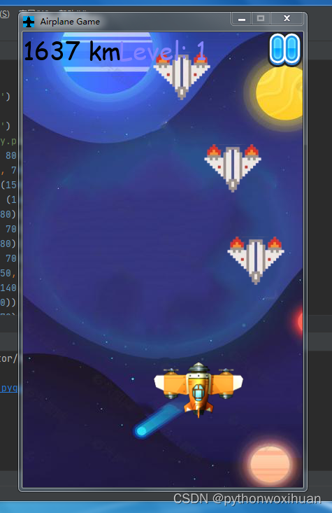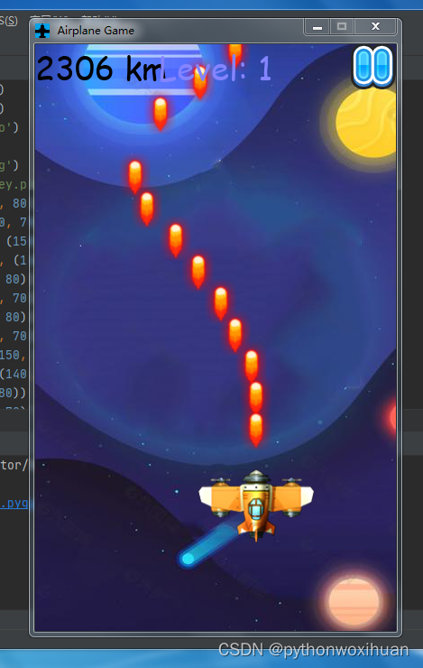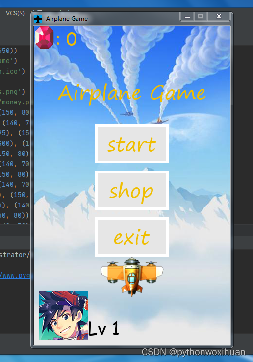 player_x = 200 - size.width() / 2def PeoPle_Draw():screen.blit(people_Img, (10, 540))font_Lv = font1.render('Lv ' + str(Lv), True, 'black')w, h = font1.size('Lv ' + str(Lv))screen.blit(font_Lv, (110, 640 - h))def Start():font_surface1 = font3.render('Airplane Game', True, (240, 190, 0))width1, height1 = font3.size('Airplane Game')screen.blit(font_surface1, (200 - width1/2, 100))pygame.draw.rect(screen, 'white', start_button)pygame.draw.rect(screen, (230, 230, 230), start_button2)font_surface2 = font3.render('start', True, (240, 190, 0))width2, height2 = font3.size('start')H1 = (70 - height2)/2 + 205screen.blit(font_surface2, (200 - width2/2, H1))pygame.draw.rect(screen, 'white', exit_button)pygame.draw.rect(screen, (230, 230, 230), exit_button2)font_surface3 = font3.render('exit', True, (240, 190, 0))width3, height3 = font3.size('exit')H2 = (70 - height3)/2 + 395screen.blit(font_surface3, (200 - width3/2, H2))pygame.draw.rect(screen, 'white', strengthen_button)pygame.draw.rect(screen, (230, 230, 230), strengthen_button2)font_surface4 = font3.render('shop', True, (240, 190, 0))width4, height4 = font3.size('shop')H3 = (70 - height4)/2 + 300screen.blit(font_surface4, (200 - width4/2, H3))screen.blit(gems, (0, 0))font_surface5 = font1.render(' : ' + str(coin), True, (240, 190, 0))screen.blit(font_surface5, (0, 0))PeoPle_Draw()Plus_1 = False