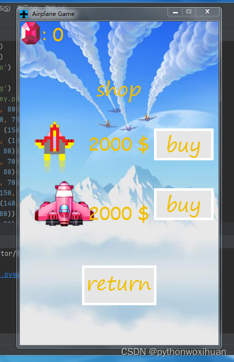 def Shop_sr():screen.blit(shop_sr_plane, (30, 200))screen.blit(shop_ssr_plane, (30, 320))price_sr = font1.render('2000 $', True, (240, 190, 0))price_w, price_h = font1.size('2000 $')screen.blit(price_sr, (200 - price_w/2, 245.5 - price_h/2))price_ssr = font1.render('2000 $', True, (240, 190, 0))price_ww, price_hh = font1.size('2000 $')screen.blit(price_ssr, (200 - price_ww / 2, 385 - price_hh / 2))pygame.draw.rect(screen, 'white', buy_sr)pygame.draw.rect(screen, (230, 230, 230), buy_sr2)pygame.draw.rect(screen, 'white', buy_ssr)pygame.draw.rect(screen, (230, 230, 230), buy_ssr2)font_buy1 = font3.render(word_sr_buy, True, (240, 190, 0))font_buy2 = font3.render(word_ssr_buy, True, (240, 190, 0))width1, height1 = font3.size(word_sr_buy)width2, height2 = font3.size(word_ssr_buy)screen.blit(font_buy1, (270 + (120 - width1) / 2, 215.5 + (64 - height1) / 2)) # 215.5, 335screen.blit(font_buy2, (270 + (120 - width2) / 2, 335 + (64 - height2) / 2))coin_surface = font1.render(' : ' + str(coin), True, (240, 190, 0))screen.blit(coin_surface, (0, 0))sr_stop = False