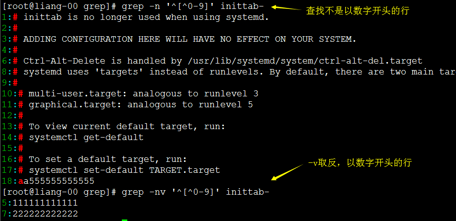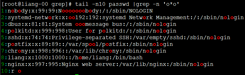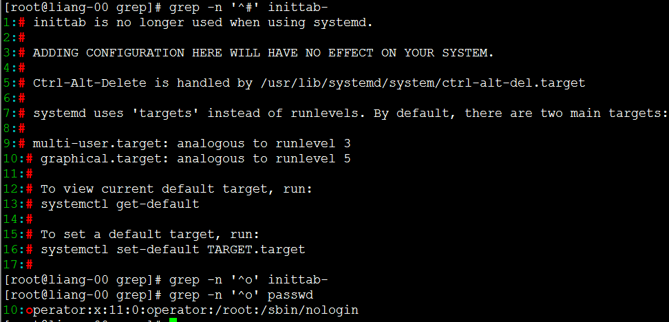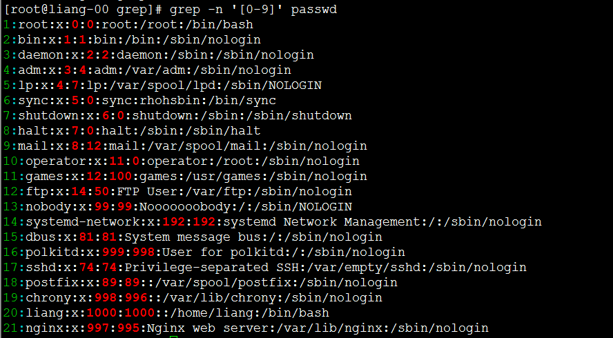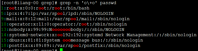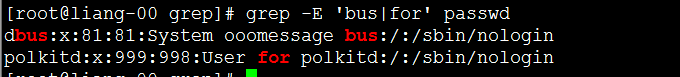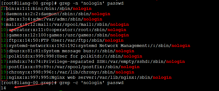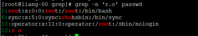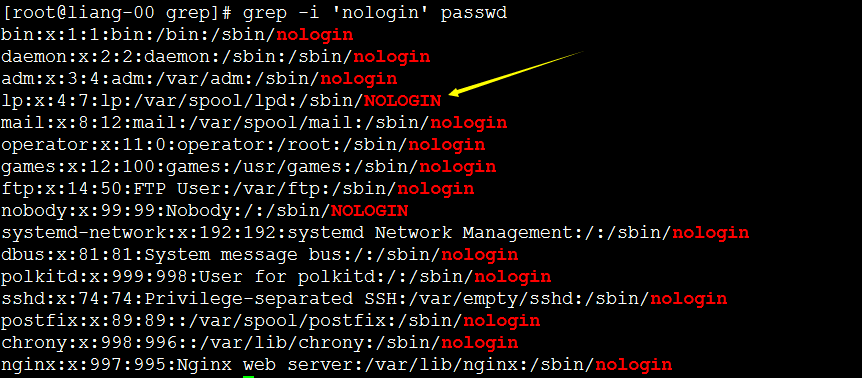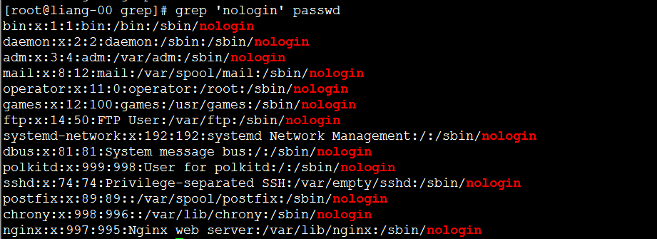 [root@liang-00 grep]# grep -iv 'nologin' passwd #反向查找不带nologin的行。 root:x:0:0:root:/root:/bin/bash sync:x:5:0:sync:/sbin:/bin/sync shutdown:x:6:0:shutdown:/sbin:/sbin/shutdown halt:x:7:0:halt:/sbin:/sbin/halt liang:x:1000:1000::/home/liang:/bin/bash [root@liang-00 grep]#