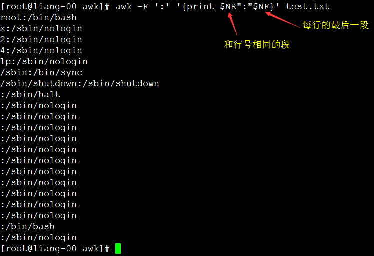 [root@liang-00 awk]# awk -F ':' '{print NR":"$0}' test.txt #表示打印出所有行带行号。