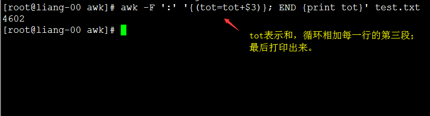 [root@liang-00 awk]# awk -F ':' '$3>=1000 {print $1,$3}' test.txt #大于1000