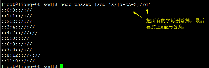 把passwd文件前十行中所有字母删除掉。