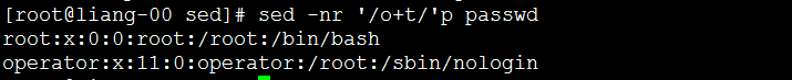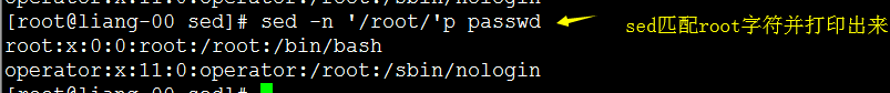 [root@liang-00 sed]# sed -e '1'p -e '/root/'p -n passwd root:x:0:0:root:/root:/bin/bash #root匹配了两次,就打印两次。 root:x:0:0:root:/root:/bin/bash operator:x:11:0:operator:/root:/sbin/nologin [root@liang-00 sed]#