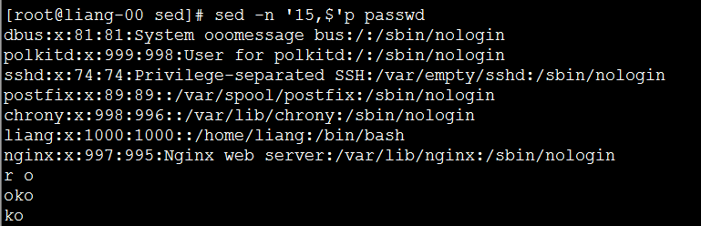 sed -n ‘15,$’p passwd 打印第15到最后一行。