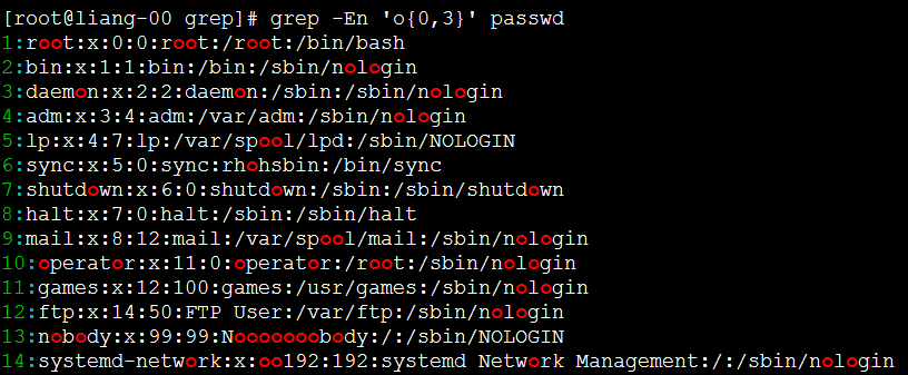 2、grep -E ‘o{0,3}’ passwd