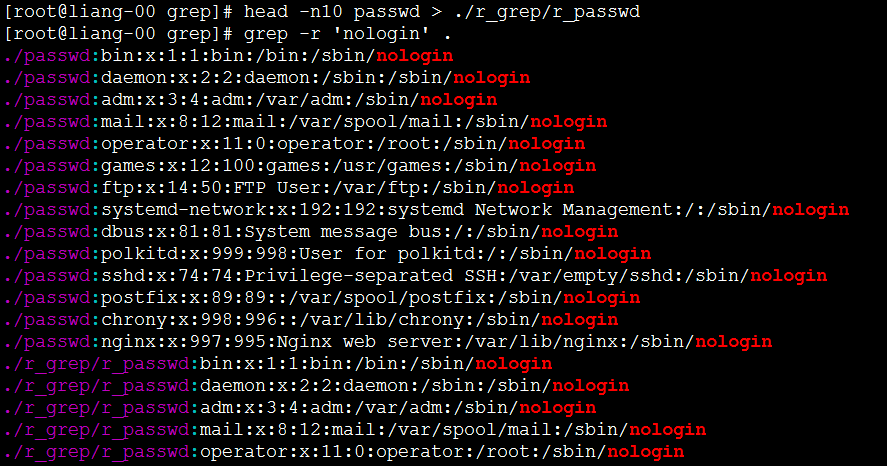-r级联遍历目录及子目录查找,在这里我先创建了 ./r_grep 目录,然后把 ./passwd里一部分内容复制到 ./r_grep/r_passwd文件内。