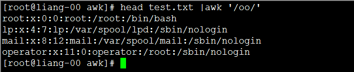 [root@liang-00 awk]# awk -F ':' 'NR<=10 && $1 ~ /root|halt/' test.txt root:x:0:0:root:/root:/bin/bash halt:x:7:0:halt:/sbin:/sbin/halt [root@liang-00 awk]#