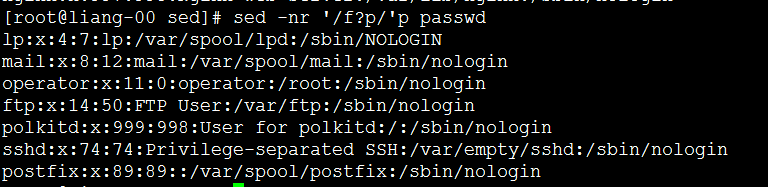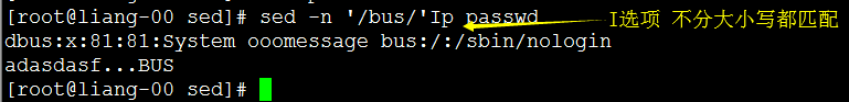 [root@liang-00 sed]# sed -e '1'p -e '/bus/'p -n passwd #不要忘了-n root:x:0:0:root:/root:/bin/bash dbus:x:81:81:System ooomessage bus:/:/sbin/nologin [root@liang-00 sed]#
