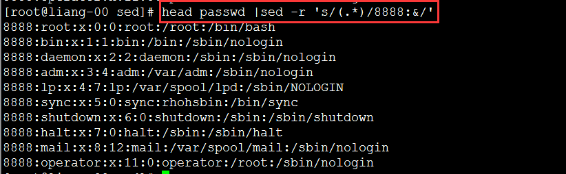 [root@liang-00 sed]# sed -r '1,10s/ro+/r/g' passwd rt:x:0:0:rt:/rt:/bin/bash bin:x:1:1:bin:/bin:/sbin/nologin daemon:x:2:2:daemon:/sbin:/sbin/nologin adm:x:3:4:adm:/var/adm:/sbin/nologin lp:x:4:7:lp:/var/spool/lpd:/sbin/NOLOGIN sync:x:5:0:sync:rhohsbin:/bin/sync shutdown:x:6:0:shutdown:/sbin:/sbin/shutdown halt:x:7:0:halt:/sbin:/sbin/halt mail:x:8:12:mail:/var/spool/mail:/sbin/nologin operator:x:11:0:operator:/rt:/sbin/nologin games:x:12:100:games:/usr/games:/sbin/nologin ftp:x:14:50:FTP User:/var/ftp:/sbin/nologin nobody:x:99:99:Nooooooobody:/:/sbin/NOLOGIN systemd-network:x:oo192:192:systemd Network Management:/:/sbin/nologin dbus:x:81:81:System ooomessage bus:/:/sbin/nologin polkitd:x:999:998:User for polkitd:/:/sbin/nologin sshd:x:74:74:Privilege-separated SSH:/var/empty/sshd:/sbin/nologin postfix:x:89:89::/var/spool/postfix:/sbin/nologin chrony:x:998:996::/var/lib/chrony:/sbin/nologin liang:x:1000:1000::/home/liang:/bin/bash nginx:x:997:995:Nginx web server:/var/lib/nginx:/sbin/nologin adasdasf...BUS
