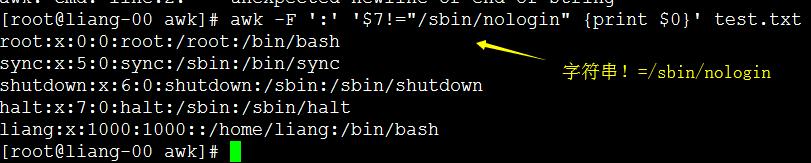 [root@liang-00 awk]# awk打印第七段不等于 /sbin/nologin 的行。