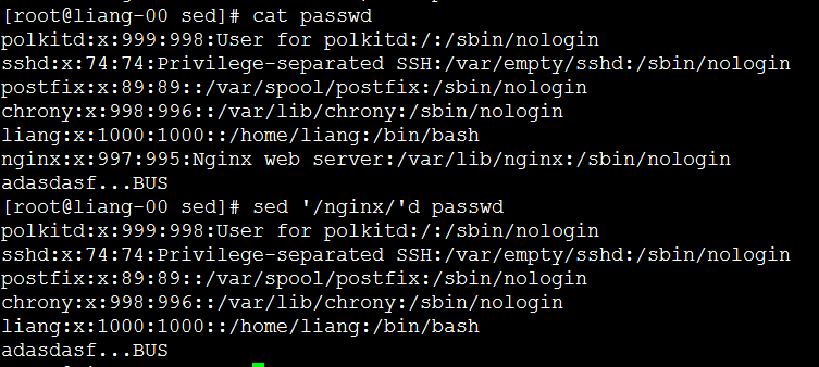 [root@liang-00 sed]# sed '1,15'd passwd #删除1到15行,没有对文件本身操作。 polkitd:x:999:998:User for polkitd:/:/sbin/nologin sshd:x:74:74:Privilege-separated SSH:/var/empty/sshd:/sbin/nologin postfix:x:89:89::/var/spool/postfix:/sbin/nologin chrony:x:998:996::/var/lib/chrony:/sbin/nologin liang:x:1000:1000::/home/liang:/bin/bash nginx:x:997:995:Nginx web server:/var/lib/nginx:/sbin/nologin adasdasf...BUS [root@liang-00 sed]# cp passwd passwd- [root@liang-00 sed]# sed -i '1,15'd passwd #删除1到15行,直接对文件本身操作。 [root@liang-00 sed]# cat passwd polkitd:x:999:998:User for polkitd:/:/sbin/nologin sshd:x:74:74:Privilege-separated SSH:/var/empty/sshd:/sbin/nologin postfix:x:89:89::/var/spool/postfix:/sbin/nologin chrony:x:998:996::/var/lib/chrony:/sbin/nologin liang:x:1000:1000::/home/liang:/bin/bash nginx:x:997:995:Nginx web server:/var/lib/nginx:/sbin/nologin adasdasf...BUS [root@liang-00 sed]#