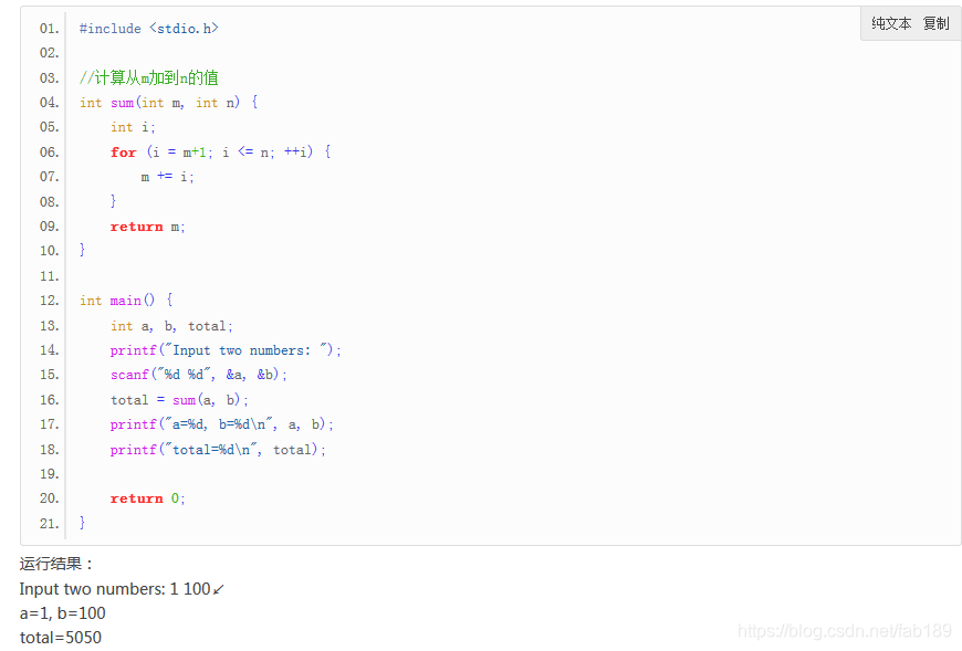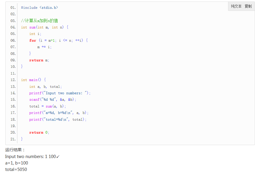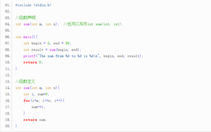 6、初学者编写的代码都比较简单,顶多几百行,完全可以放在一个源文件中。对于单个源文件的程序,通常是将函数定义放到 main() 的后面,将函数声明放到 main() 的前面,这样就使得代码结构清晰明了,主次分明。