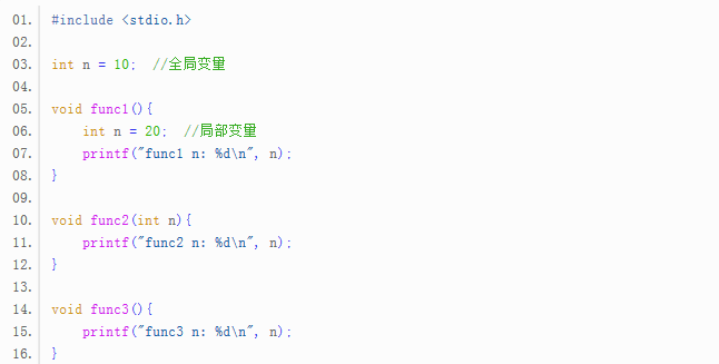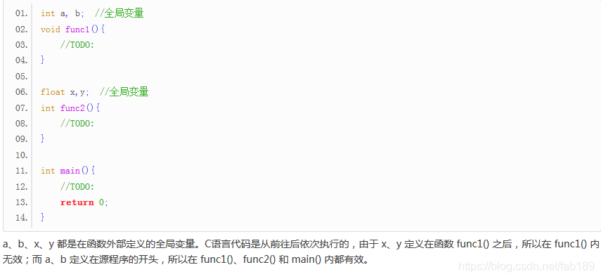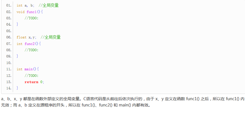 在所有函数外部定义的变量称为全局变量(Global Variable),它的作用域默认是整个程序,也就是所有的源文件,包括 .c 和 .h 文件,如果给全局变量加上 static 关键字,它的作用域就变成了当前文件,在其它文件中就无效了
