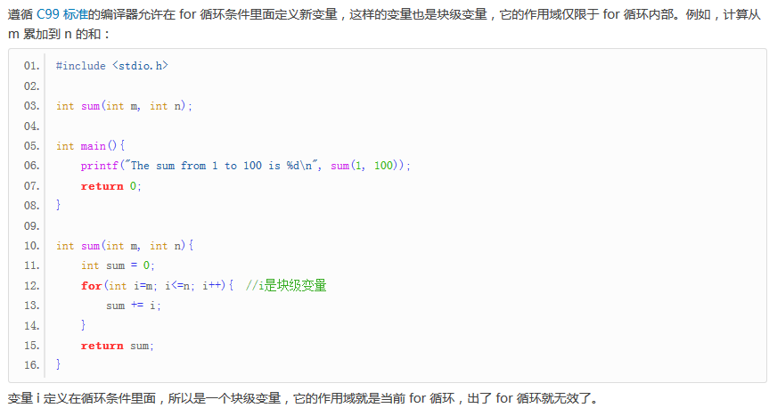 C语言允许在代码块内部定义变量,这样的变量具有块级作用域;换句话说,在代码块内部定义的变量只能在代码块内部使用,出了代码块就无效了,所谓代码块,就是由{ }包围起来的代码。代码块在C语言中随处可见,例如函数体、选择结构、循环结构等。不包含代码块的C语言程序根本不能运行;