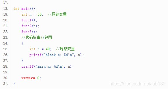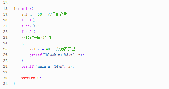 7) C语言规定,只能从小的作用域向大的作用域中去寻找变量,而不能反过来,使用更小的作用域中的变量。对于 main() 函数,即使代码块中的 n 离输出语句更近,但它仍然会使用 main() 函数开头定义的 n,所以输出结果是 30