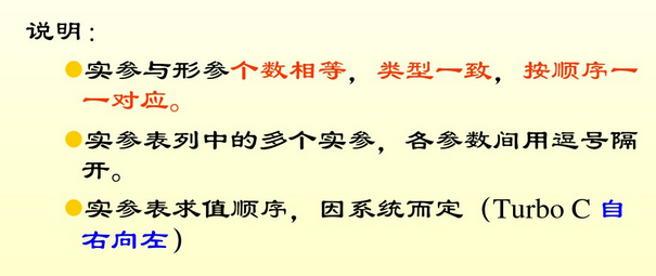 2) 实参可以是常量、变量、表达式、函数等,无论实参是何种类型的数据,在进行函数调用时,它们都必须有确定的值,以便把这些值传送给形参,所以应该提前用赋值、输入等办法使实参获得确定值。