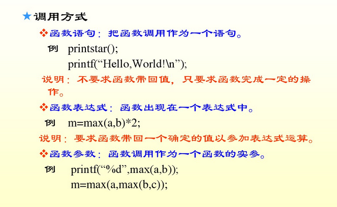 1、,函数就是 C 语言的模块,一块一块的,有较强的独立性,可以相互调用,换句话说,C 语言中,一个函数里面可以调用 n 个函数,即大函数调用小函数,小函数又调用“小小”函数。这就是结构化程序设计,所以面向过程的语言又叫结构化语言。