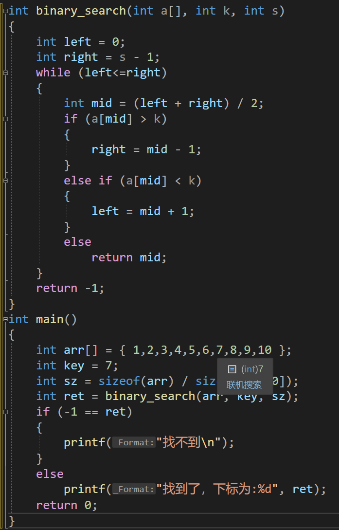 {int arr[] = { 1,2,3,4,5,6,7,8,9,10 };int key = 7;int sz = sizeof(arr) / sizeof(arr[0]);int ret = binary_search(arr, key, sz);if (-1 == ret){printf("找不到\n");}elseprintf("找到了,下标为:%d", ret);return 0;