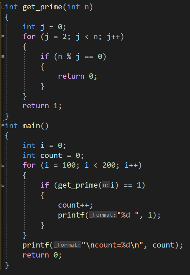 {int i = 0;int count = 0;for (i = 100; i < 200; i++){if (get_prime(i) == 1){count++;printf("%d ", i);}}printf("\ncount=%d\n", count);return 0;