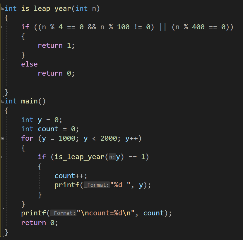 {int y = 0;int count = 0;for (y = 1000; y < 2000; y++){if (is_leap_year(y) == 1){count++;printf("%d ", y);}}printf("\ncount=%d\n", count);return 0;