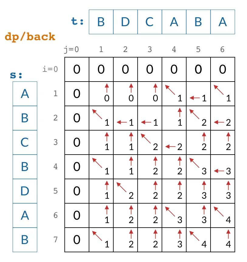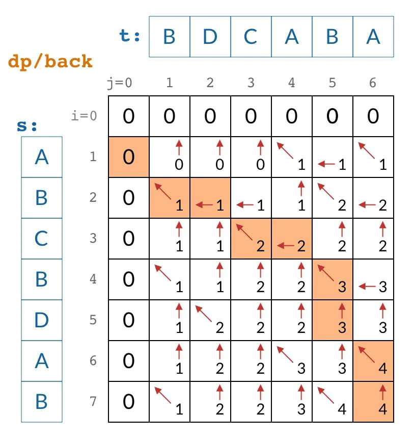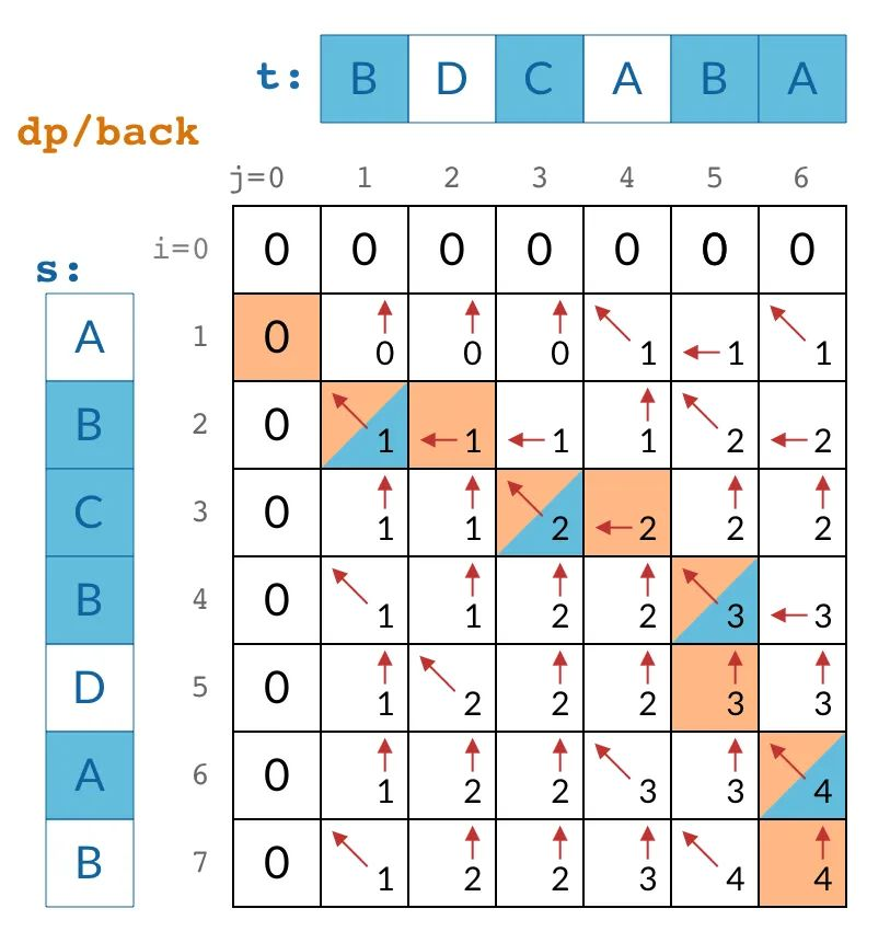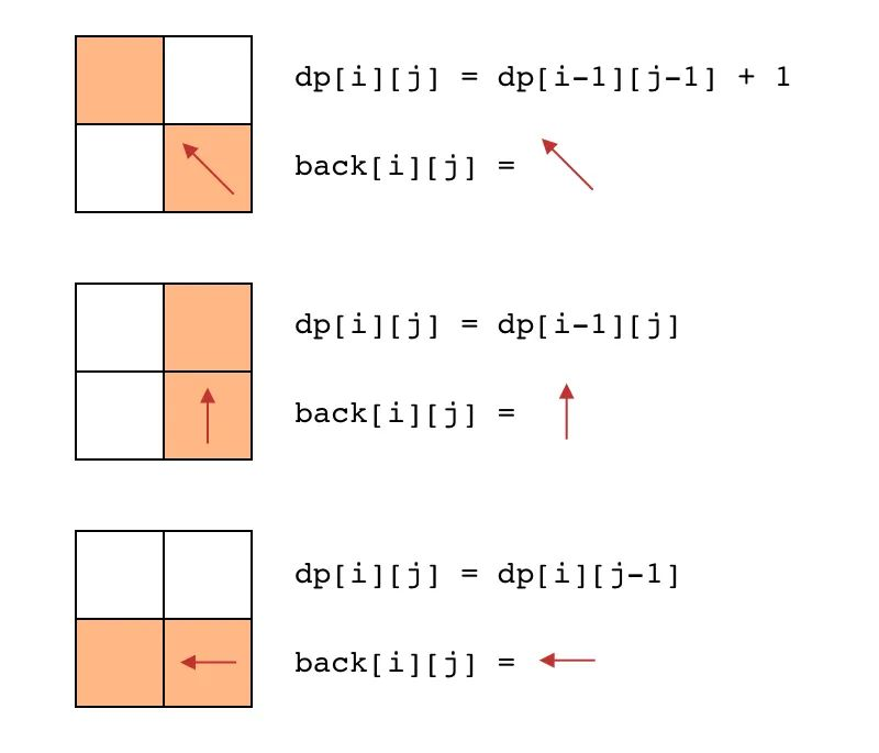同样的,我们可以从 dp[m][n] 出发,根据 back 数组一路往回找,其实就是按照「箭头」的方向回退: