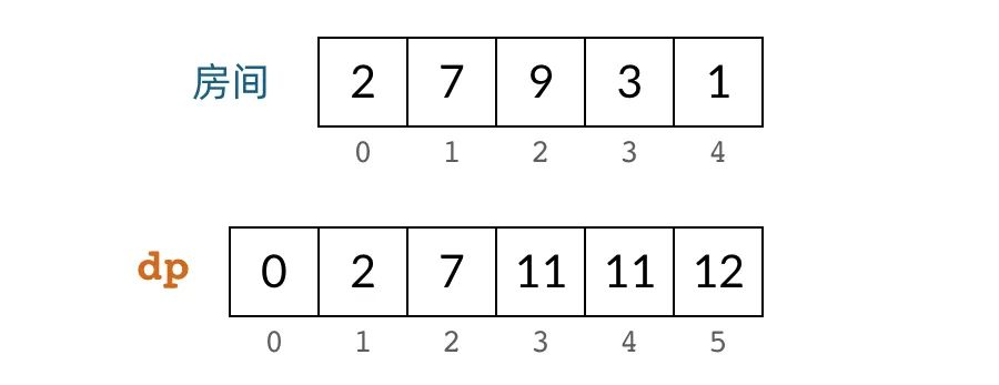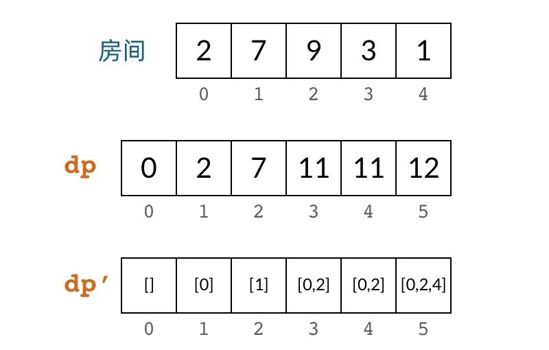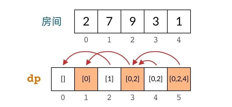 例如,dp[3] = [0, 2] 表示偷前 3 个房子的最优方案是偷第 0、第 2 号房子。我们按照以下规则构造 DP 数组: