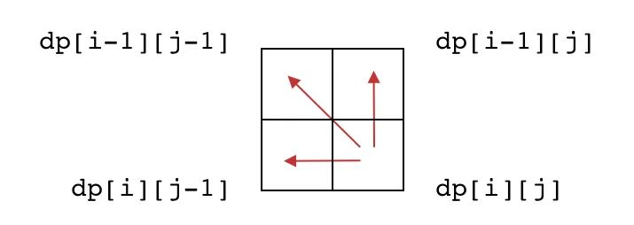 可以看到,dp[i][j] 的值可能来自左上(即 dp[i-1][j-1])、上方(即 dp[i-1][j])或左方(即 dp[i][j-1])。