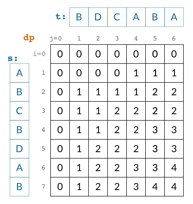 首先我们来看一下 DP 数组是什么样子的。以 s = “ABCBDAB”、t = “BDCABA” 为例,DP 数组的内容为: