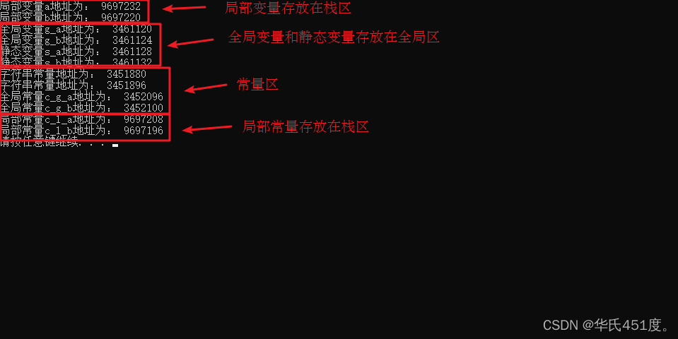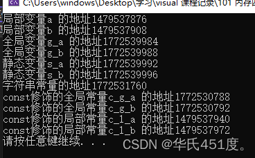//常量//字符串常量cout << "字符串常量的地址" << (int)&"hello world" << endl;//字符串常量也存放在全局区//const修饰的常量//const修饰的全局变量与局部变量cout << "const修饰的全局常量c_g_a 的地址" << (int)&c_g_a << endl;cout << "const修饰的全局常量c_g_b 的地址" << (int)&c_g_b << endl;//存放在全局区