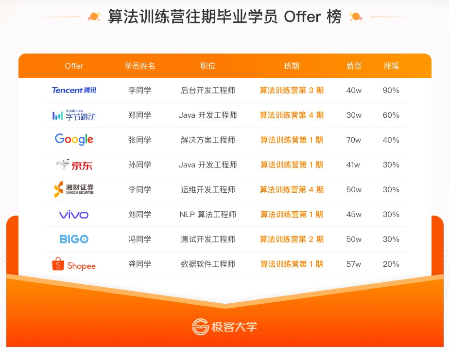 算法训练营已经开到第 21 期,已经有 4000+ 技术人参加学习,已经毕业的学员中,很多都拿到了 Google、阿里、腾讯、头条、美团等等一线大厂的 Offer,薪资涨幅普遍在 30-40%,有的学员甚至可以达到 90%。