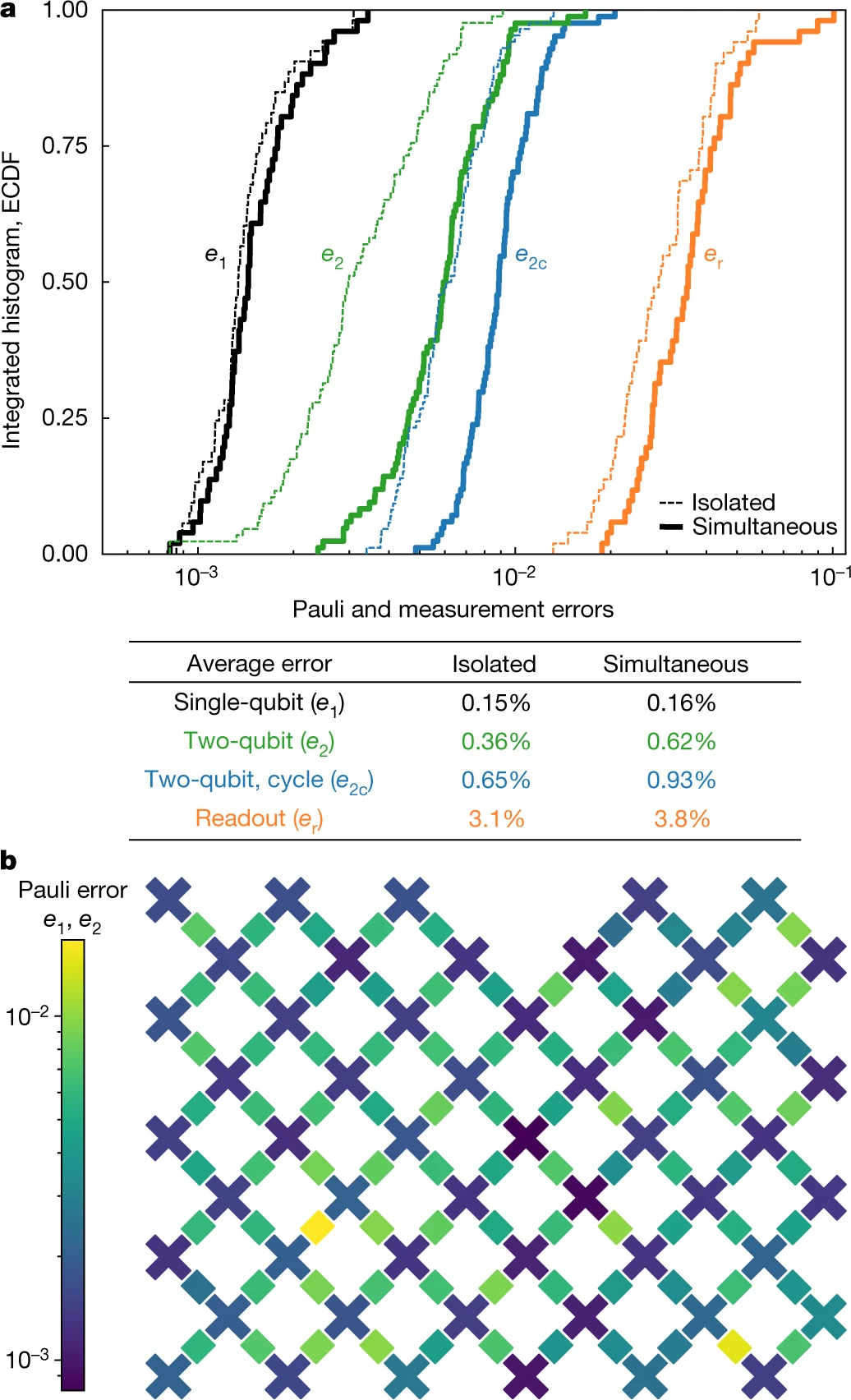 我们的目标是通过足够宽和深的电路实现足够高的FXEB,这样经典计算的成本将高的难以承受。这是一个艰巨的任务,因为我们的逻辑门并不完美,我们打算构造的量子态对错误也很敏感。在算法运行过程中,单个比特或相位的翻转将彻底重构斑点图案并且导致保真度逼近0(请参见补充信息)。因此,为了宣称量子的优越性,我们需要一个能够以非常低的错误率运行程序的量子处理器。
