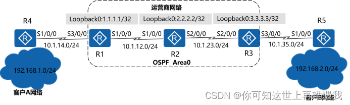 配置10.1.12.0/24、10.1.23.0/24两个网段以及运营商网络各设备的LoopBack0接口属于OSPF Area0。