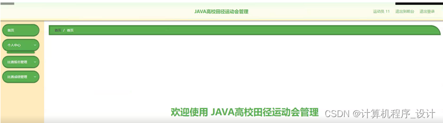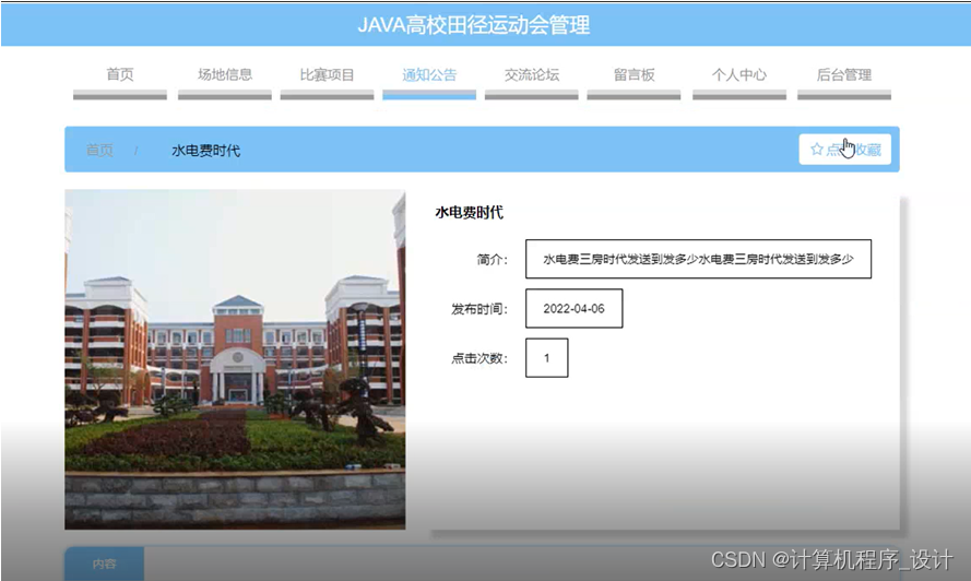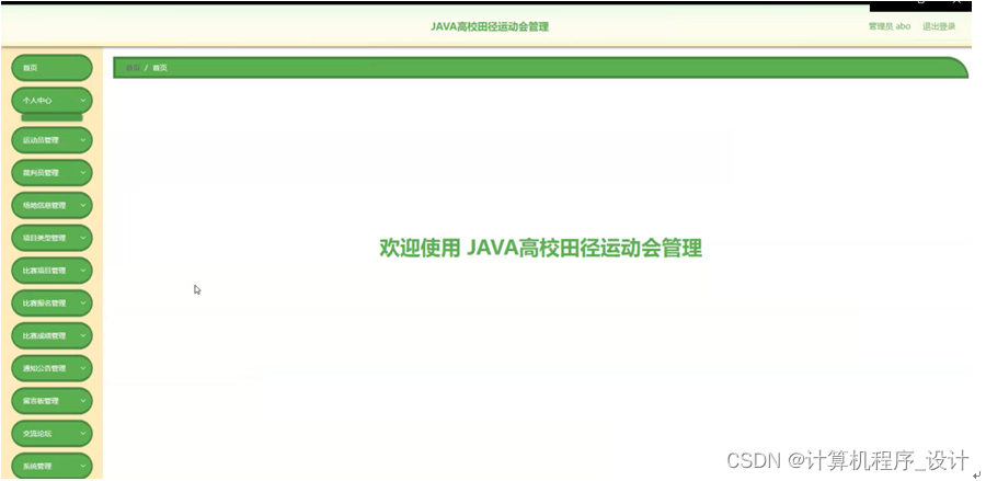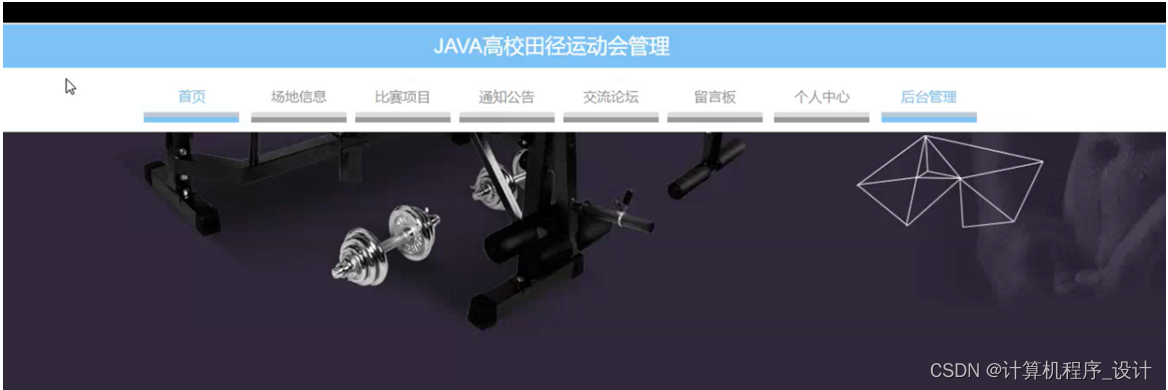 高校田径运动会管理,在系统首页可以查看首页、场地信息、比赛项目、通知公告、交流论坛、留言板、个人中心、后台管理等内容进行详细操作,如图5-1所示。