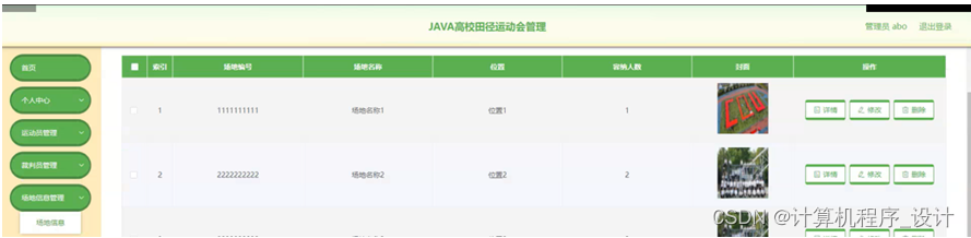 场地信息管理,在场地信息管理页面可以对索引、场地编号、场地名称、位置、容纳人数、封面等内容进行详情,修改和删除等操作,如图5-9所示。