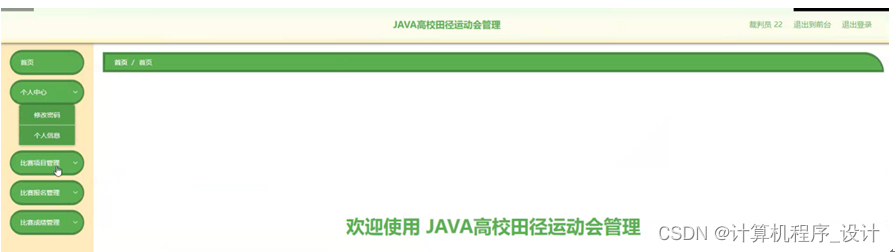 裁判员,在裁判员页面可以对首页、个人中心、比赛项目管理、比赛报名管理、比赛成绩管理等内容进行相应的操作,如图5-15所示。