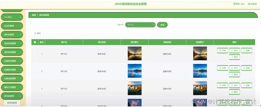 留言板管理,在留言板管理页面可以对索引、用户名、留言内容、留言图片、回复内容、回复图片等内容进行详情,修改,回复和删除等操作,如图5-14所示。