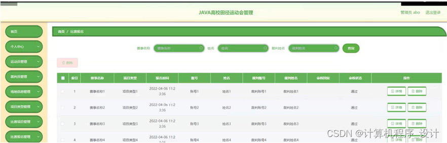 比赛报名管理,在比赛报名管理页面可以对索引、赛事名称、项目类型、报名时间、账号、姓名、裁判账号、裁判姓名、审核回复、审核状态等内容进行详情和删除等操作,如图5-12所示。