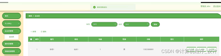运动员管理,在运动员管理页面可以对索引、账号、姓名、年龄、性别、手机、照片等信息进行详情,修改和删除等操作,如图5-7所示。