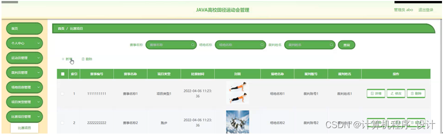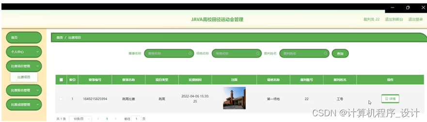 比赛项目管理,在比赛项目管理页面可以对索引、赛事编号、赛事名称、项目类型、比赛时间、封面、场地名称、裁判账号、裁判姓名等内容进行详情等操作,如图5-16所示。