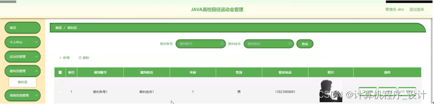 裁判员管理,在裁判员管理页面可以对索引、裁判账号、裁判姓名、年龄、性别、联系电话、照片等信息进行详情,修改和删除等操作,如图5-8所示。