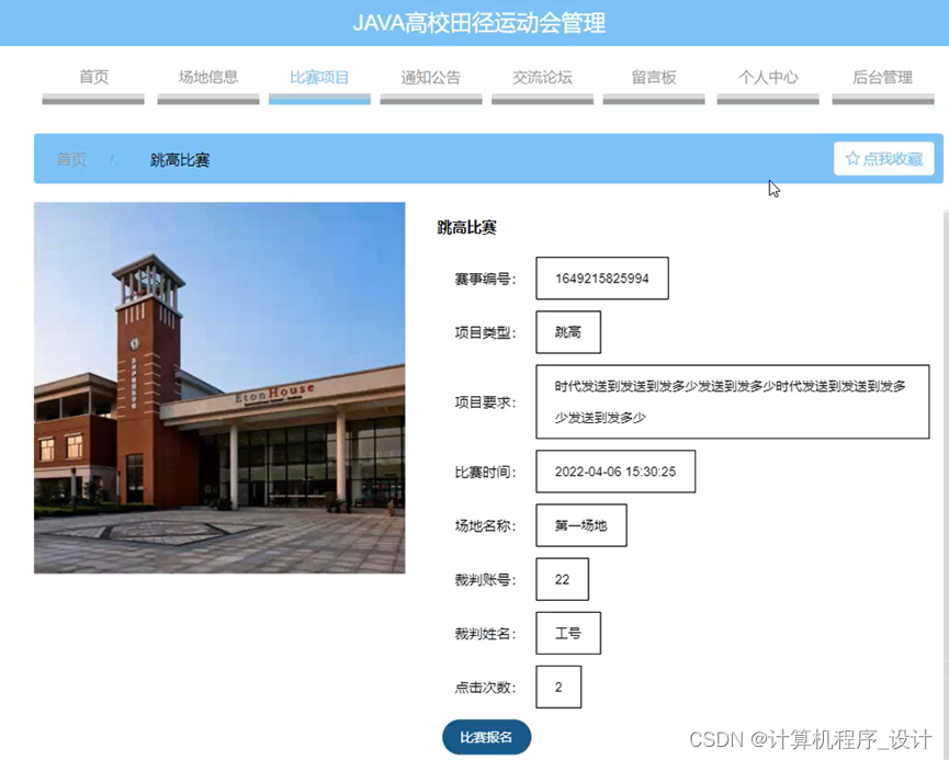 比赛项目,在比赛项目页面可以查看赛事编号、项目类型、项目要求、比赛时间、场地名称、裁判账号、裁判姓名、点击次数等详细内容,并进行比赛报名操作,如图5-3所示。