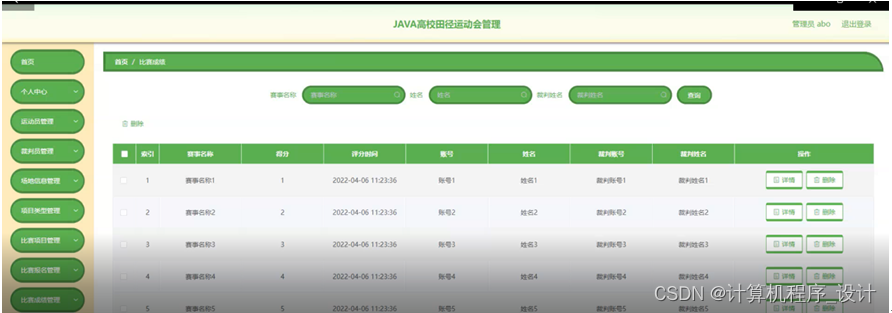 比赛成绩管理,在比赛成绩管理页面可以对索引、赛事名称、得分、评分时间、账号、姓名、裁判账号、裁判姓名等内容进行详情和删除等操作,如图5-13所示。