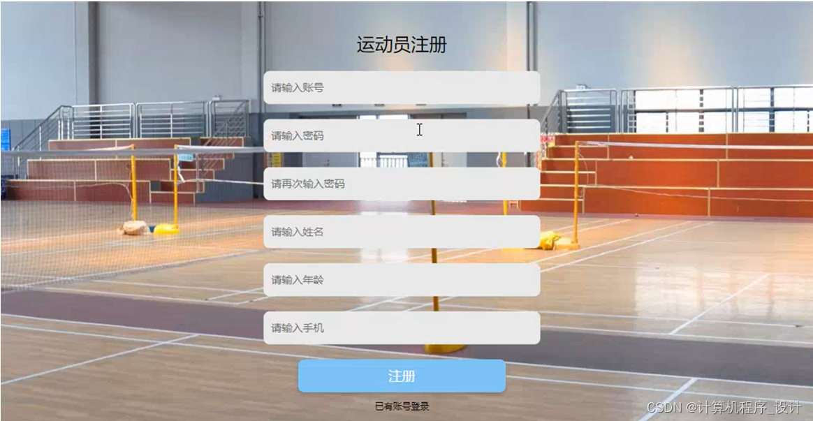运动员注册,在运动员注册页面通过填写账号、密码、再次输入密码、姓名、年龄、手机等信息完成运动员注册,如图5-2所示。