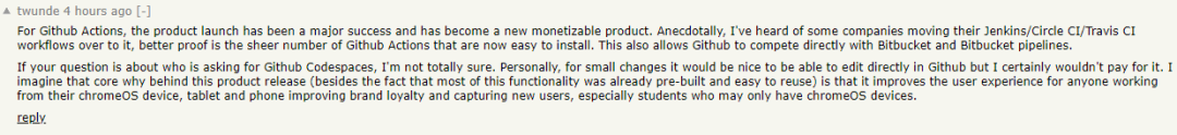 另一方面,也有开发者坦言,能完全在 Github 上编辑代码固然非常友好,但如果要作为产品而言为其付费现阶段是不可能的。