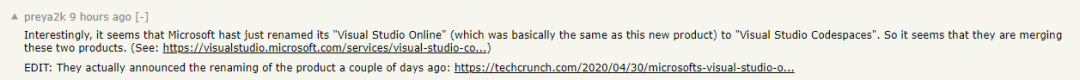 然而不到几日前,VS Online 正式改名为 VS Codespaces,与今日推出的 Github Codespaces 仅有前缀之差,这一点非常有趣,有开发者猜测通过这些细节似乎表明了微软想要将这两个产品合并。