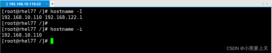 如果不会上述ifconfig方法,可以使用hostname -i或hostname -I(大写的i)命令,也可以快速获取ip地址,默认hostname -I的结果来自ifconfig的输出;hostname -i的结果来自/etc/hosts文件,如果/etc/hosts文件没有配置IP地址和主机名的映射,则hostname -i会从ifconfig的输出获取。